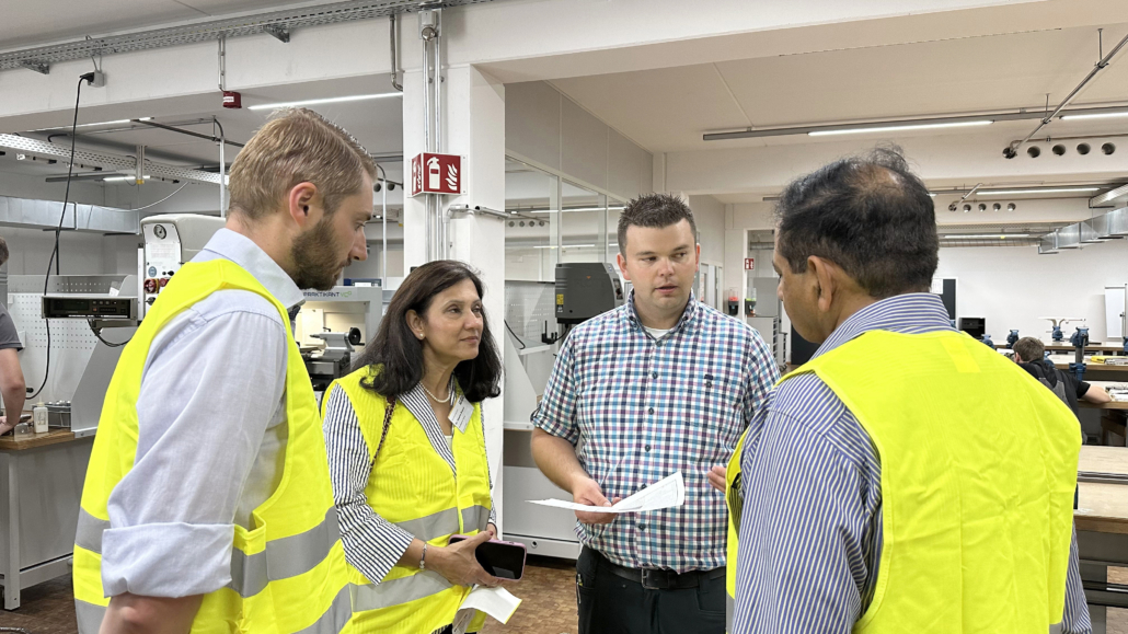 Ein weiterer Punkt war an diesem Tag der Firmenbesuch bei KAESER Kompressoren. Unter der Regie von Rüdiger Hopf, Ausbildungsleiter bei KAESER, standen auf Wunsch der Gäste Informationen zu den Lehrwerkstätten auf dem Programm. Die beiden Ausbilder Marco Scheler (Elektro) und Manuel Truckenbrodt (Metall) führten Vandita und Abhay Prasad durch die jeweiligen Werkstätten. Ausführlich wurden die Maschinen und Werkzeuge erläutert, sowie Erklärungen zu den Projekten gegeben. Auch hier zeigten die Nachfragen das große Interesse am Dualen Ausbildungssystem. Es stellte sich auch heraus, dass einige Parallelen zu den Werkstätten der Toledo Technology Academy vorhanden sind. Dr. Rolf Eberwein, Geschäftsführer der KAESER Ausbildung GmbH, begrüßte kurz die Gäste aus den USA und wünschte viel Erfolg bei den weiteren Vorhaben.